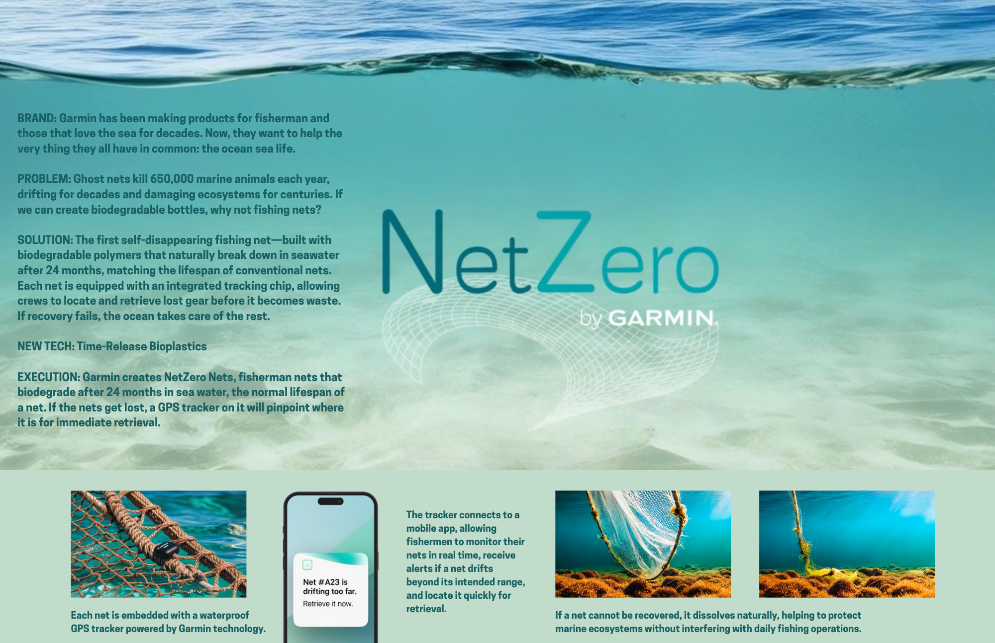 Execution: Garmin creates NetZero, fisherman nets that biodegrade after 24 months in sea water, the normal lifespan of a net. If the nets get lost, a GPS tracker on it will pinpoint where it is for immediate retrieval.